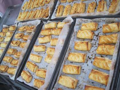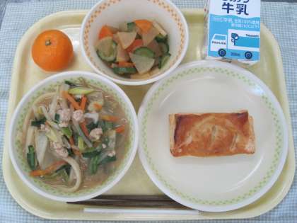 11月19日の給食 公開日 2021/11/19 更新日 2021/11/19 ☆給食☆ 町田産キャベツの白ごまたんたんうどん 町田産大根の華風漬け 和風マロンパイ みかん 今日は、食育の日に合わせて、町田産のキャベツと大根を使った献立にしました。町田産の野菜を使うと仕上がりがよりおいしく感じられます。デザートは、栗の入った白いんげん豆のあんをパイシートに包んで焼いた和風マロンパイです。 給食