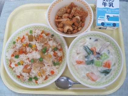 11月25日の給食 公開日 2021/11/25 更新日 2021/11/25 ☆給食☆ えびピラフ チンゲン菜のクリーム煮 ごぼうナッツ 今日のチンゲン菜のクリーム煮は、小麦粉とバターで作るルウではなく、米粉でとろみをつけて作りました。米粉を使うとカロリーが抑えられヘルシーに仕上がります。 給食
