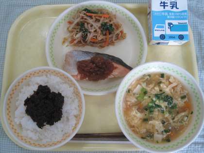 11月29日の給食 公開日 2021/11/29 更新日 2021/11/29 ☆給食☆ ご飯(手作りのりの佃煮) 鮭の和風マリネ むらくも汁 野菜のごま和え 今日ののりの佃煮は、給食室で手作りしたものです。のりは、たんぱく質・ビタミン類・食物繊維など栄養がたくさんつまった食品です。中でも多く含まれるビタミンB1は、ご飯をエネルギーにかえるのに必要な栄養素なので、ごはんとのりの組み合わせは、理想的といえます。のりの佃煮でご飯をおいしくいただきましょう。 給食