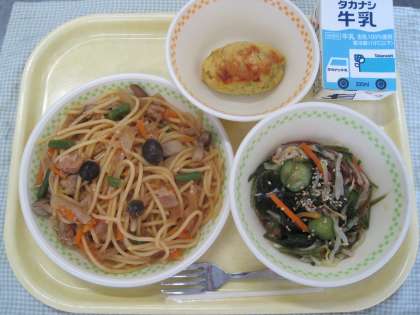 11月30日の給食 公開日 2021/11/30 更新日 2021/11/30 ☆給食☆ ツナときのこの和風スパゲティ 海藻サラダ スイートポテト 11月最後の給食は、スイートポテトを手作りしました。スイートポテトに使ったさつま芋は、甘くてホクホクした食感が特徴の紅あずまです。スイートポテトは、さつま芋を1本1本丁寧に皮をむき、切って、蒸して、つぶして、砂糖と牛乳と生クリームを混ぜ、形を整えて、卵黄をぬってオーブンで焼きました。旬のさつま芋を味わっていただきましょう。 給食