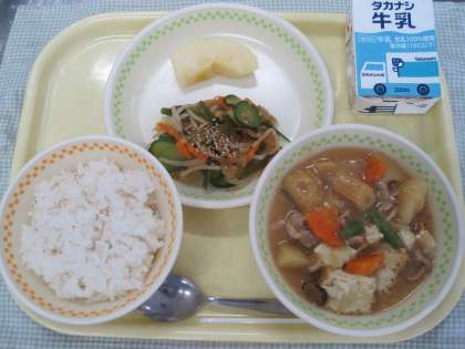 12月2日の給食 公開日 2021/12/02 更新日 2021/12/02 ☆給食☆ 麦ご飯 家常豆腐 茎わかめのサラダ りんご 家常豆腐は、家庭でよく食べられる豆腐料理という意味の中国四川省の家庭料理です。給食では、生揚げを使って作りました。具沢山で、味噌味で、ご飯が進むおかずです。 給食