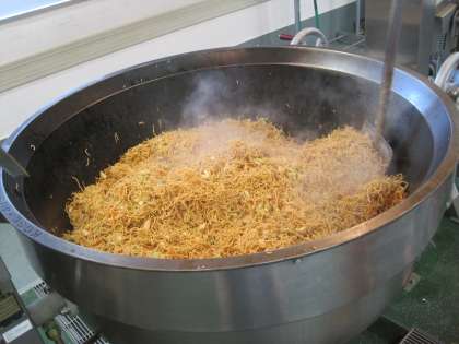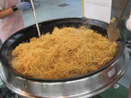今日は、岡山県蒜山高原で食べられているメニューの「蒜山(ひるぜん)味噌焼きそば」です。蒜山の焼きそばとして地元の人々に親しまれていたところ、近年B級グルメとして全国的に名前が知られてきました。給食の焼きそばは、完全に火を通すため、焼きそばの具を炒めたところに、揚げた麺を入れて混ぜ合わせて作っています。