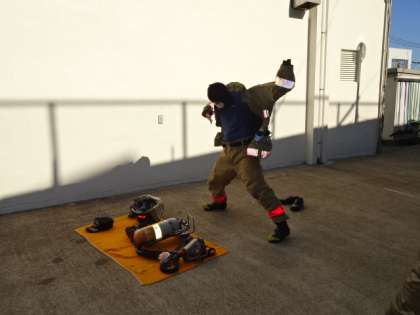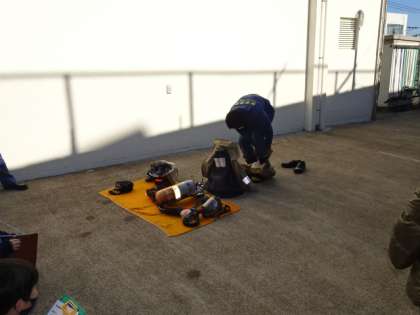 消防官の早着替えです。司令があってから1分で出動できるように45秒を目標に着替えるそうです。靴から履き替え、「後ろ良し!」と後方を確認して上着をバサッと着ます。タンクなどを背負って45秒で着替えて3年生が拍手をしていました。