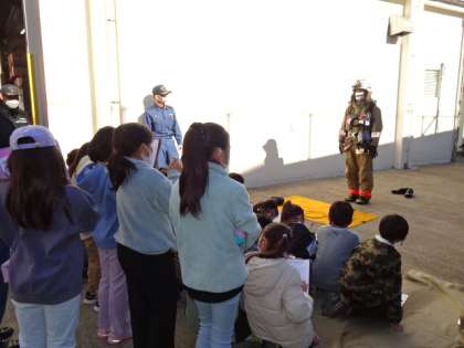 見学の終わりには、鶴川出張所に出動要請がきてみんなの目の前で、出動していく様子も見学することができました。みんな見たたことや聞いたことをたくさんメモしていました。