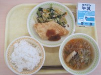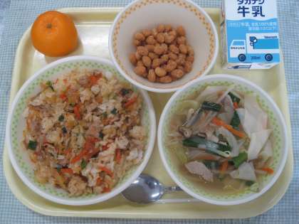 2月2日の給食 公開日 2022/02/02 更新日 2022/02/02 ☆給食☆ キムチチャーハン ワンタンスープ きなこビーンズ ぽんかん 今日のキムチチャーハンは、町田市の白菜で作られたキムチを使用して作りました。町田産の白菜を使用している思うと、よりおいしく感じられます。キムチチャーハンは、見た目は辛そうですが、1年生でもおいしく食べられるような味付けになっています。 給食