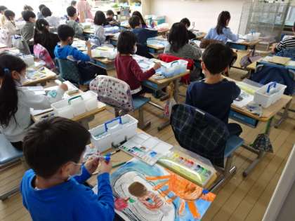 1年生 図工 できたらいいなこんなこと 公開日 2022/02/05 更新日 2022/02/05 鶴一日記 1年生が『こんなことができたらいいな〜と』想像をふくらませながら絵を描いていました。犬の背中に乗って宇宙旅行がしたいな、食べられるスイカの山を描いたよ、恐竜と飛んでみたいな、などなど楽しい絵になりました。絵の具にも慣れてきて、背景を少し薄めに塗るめあてで取り組んでいました。 全学年
