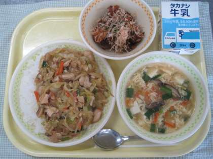 2月16日の給食 公開日 2022/02/16 更新日 2022/02/16 ☆給食☆ タッカルビ丼 にら玉スープ お好みポテト 今日は韓国の料理「タッカルビ」を作りました。タッカルビとは、鶏肉と野菜をコチュジャンで甘辛く炒めた料理です。給食では、タッカルビをご飯にかけていただきます。 給食
