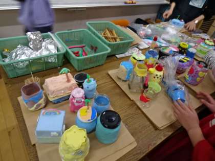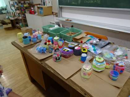 3年生が図工で、小物入れを作っていました。紙粘土に絵の具を混ぜて思い思いの色や形を作り持ってきた瓶につけていきます。それぞれの個性が見えます。作品一つ一つに自分のストーリーがあるのです。