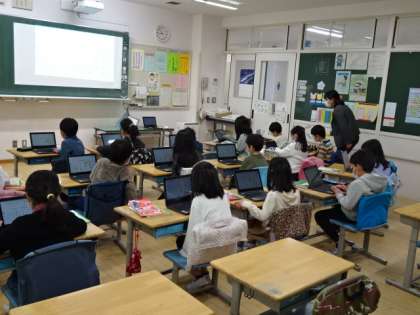 次は2年生です。国語の学習をしていました。児童の詩を書画カメラで映して発表しているクラスや『カンジーはかせの大はつめい』の学習で漢字の組み合わせの学習をしているクラスがありました。