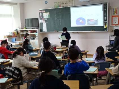 3年生のこの2クラスは総合的な学習で各自が作った冬季オリンピックの種目のスライドを調べて作ったスライドを発表していました。スライドづくりにも慣れて、背景を工夫したり、アニメーションの工夫をしたりしていました。