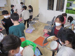 グループで教え合いながら楽器の練習をしています。