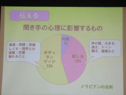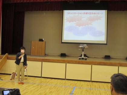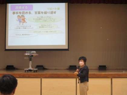 27日(火)、丸節子先生を講師にお招きして『子どもをやる気にさせるコミュニケーション』をテーマに講演会が開催されました。「叱るのではなく伝える」というスタンスで子どもと話すことや聞き手の心理に与える影響は内容よりも、声の大きさやトーン、目線等の方が大きいこと等とても勉強になりました。