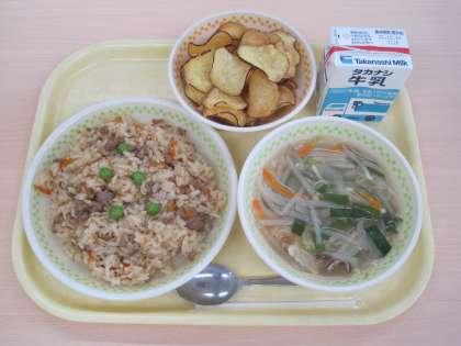 10月19日の給食 公開日 2022/10/19 更新日 2022/10/19 ☆給食☆ 世界味めぐり給食〜ベトナム〜 コムチェン(ベトナム風チャーハン) フォー・ガー(米粉麺と鶏肉のスープ) さつまいもチップス 牛乳 給食