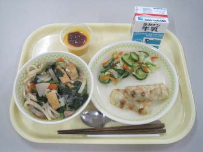 給食では、みんなの健康を祈って「ん」のつく食材を入れた運盛りうどんを作りました。