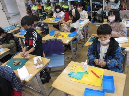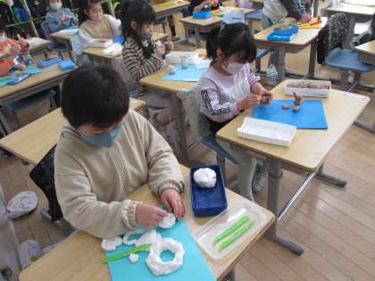 図工で、「みて みて いっぱい つくったよ」の学習をしました。粘土を丸めたり、平らにしたりなどして、楽しく作ることができました!