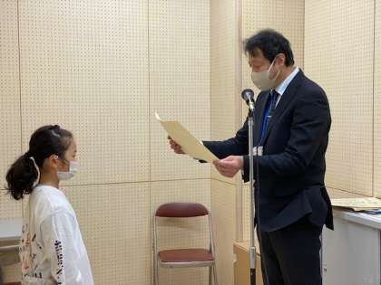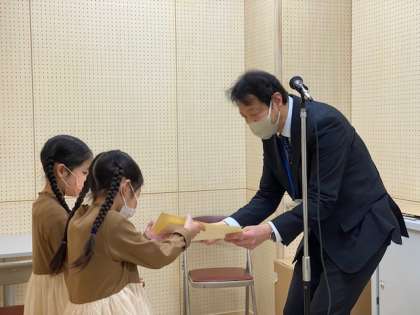 3番目、4番目の表彰は、東京都の児童表彰でした。コロナ禍で都庁で行われる筈の表彰式が中止となってしまったため、全校朝会での表彰となりました。レスリングの大会で優勝な成績を収めた児童、ピアノのコンクールの連弾の部で優勝な成績を収めた児童を全校でお祝いしました。大会やコンクールの成績だけでなく、他の児童の範となる学校生活での態度等も表彰の対象となっていました。
