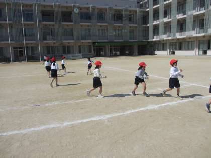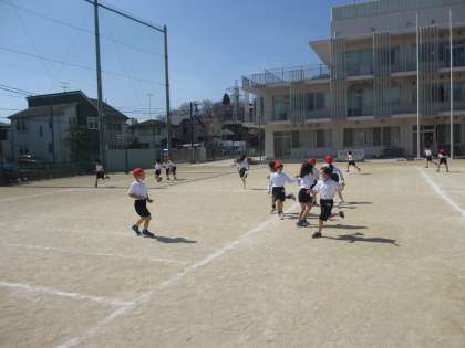 先月までに比べ、暖かくなってきました。1年生は体育で“しっぽ取り”をしました。校庭で元気に体を動かしました。