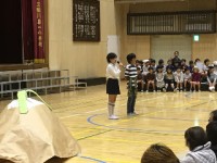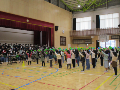 次は2年生からのプレゼントで、2年生が運動会で踊った「じょいふる」を6年生を送る会バージョンにして歌と踊りを披露しました。「じょういふる」の歌詞を替え歌にして、6年生の感謝の気持ちを伝えました。