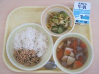 ご飯そぼろ入り卵焼きツナのカレー風味サラダじゃがいもと玉ねぎのみそ汁牛乳ツナのカ...