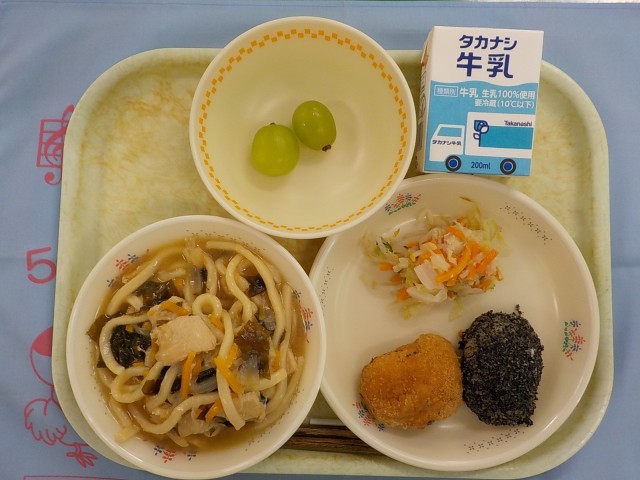 今日の給食 【行事食:お彼岸】 わかめうどん 2色おはぎ(きなこ・黒ごま) キャベツの酢みそ和え シャインマスカット 牛乳