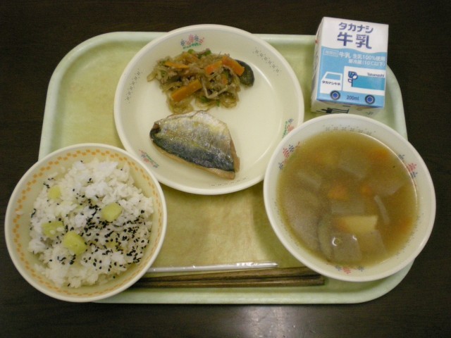 今日の給食 さつまいもごはん 魚の塩こうじ焼き あまみそ炒め けんちん汁 牛乳