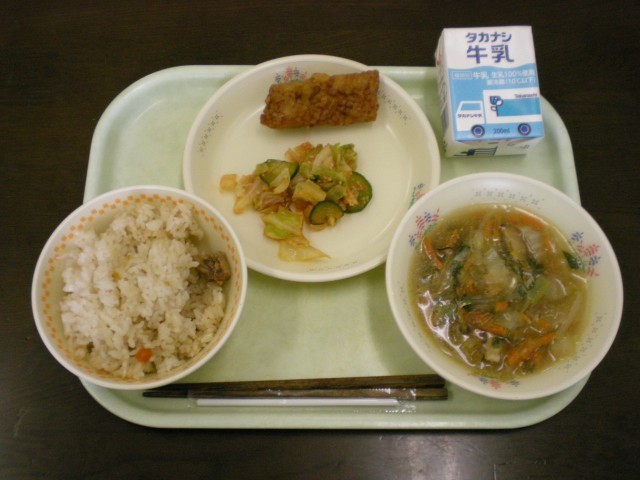 今日の給食 中華おこわ いかのさらさ揚げ 即席キムチ はるさめスープ 牛乳