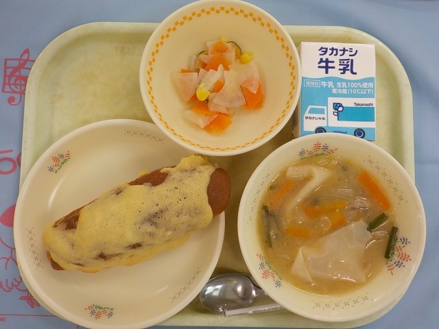 今日の給食 ビスキュイパン カラフルサラダ みそワンタンスープ 牛乳