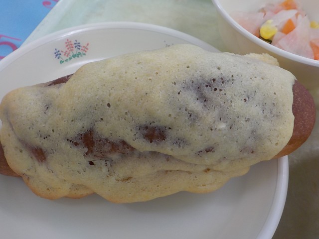 『ビスキュイパン』は、パンの上に小麦粉やバター、たまご、さとうをまぜた「ビスキュイ」の生地をのせて、オーブンで焼いて作りました。「ビスキュイ」とは、フランス語でクッキーやケーキなどの焼き菓子といった意味があります。今日はその生地にすこ~しだけラム酒というお酒を入れて、香りをつけています。メロンパンよりも甘さがひかえめで、牛乳やスープとも相性がよいです。10月の給食目標は「よくかんでのこさず食べる」です。苦手な食べものも、ひと口は挑戦してみましょう!