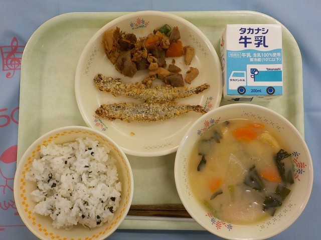 今日の給食 【行事食:十五夜】 わかめごはん ししゃものさざれ焼き こんにゃくのおかか煮 月見汁 牛乳