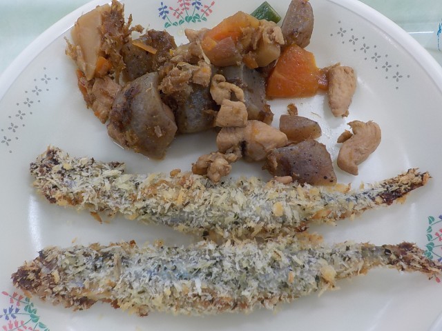 10月6日の今日は「十五夜」です。「中秋 の 名月」や「芋名月」ともいい、おだんごやススキをかざり、秋の収穫に感謝する行事でもあります。1年で1番美しい月とされていますので、晴れていたらぜひ夜空を見上げてみてください。今日の『月見汁』には、かぼちゃで色をつけた手作りの満月色のおだんごが入っています。のどにつまらせないようによくかんで食べましょう。今日の魚は「ししゃも」です。さざれ焼きの「さざれ」とは、小さい、細かいという意味です。国歌の「君が代」にも小さな石という意味の「さざれ石」が出てきますね。細かいパン粉をつけて焼くことから、「さざれ焼き」と呼ばれるようになったそうです。