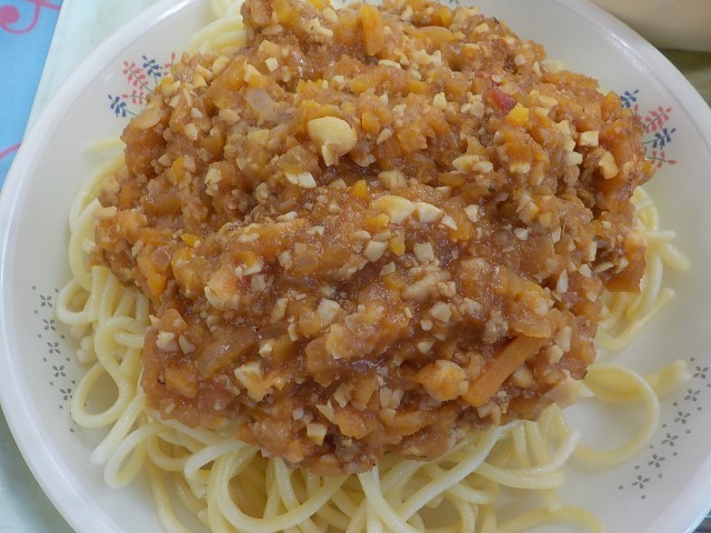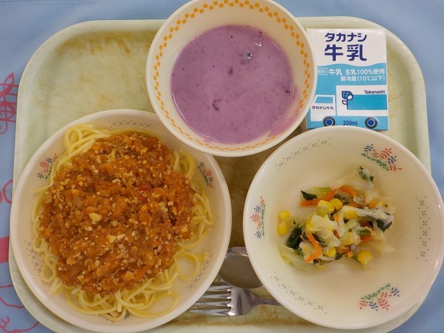 今日の給食 【目の愛護デー献立】 ミートソーススパゲッティ ポパイサラダ ブルーベリーヨーグルト 牛乳