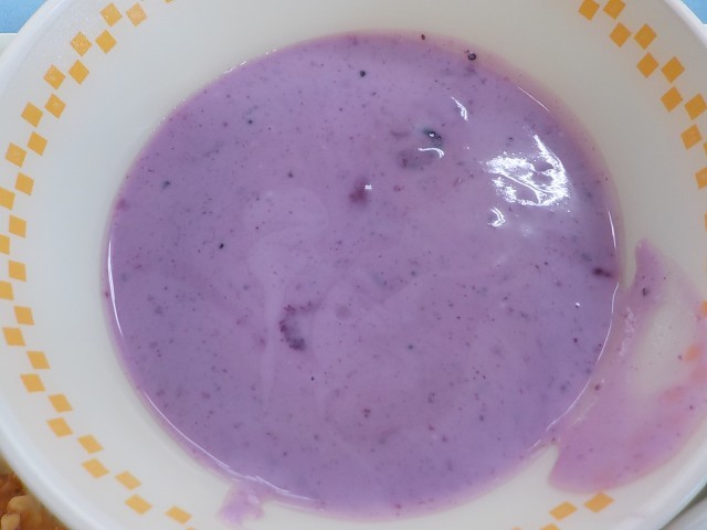 10月10日は「目の愛護デー」です。目の健康について考えましょう!という日です。目の健康のためには、まずいろいろな食べ物を食べて、バランスよく栄養をとることが大切です。今日の給食では目によいとされる「ブルーベリー」を使ってソースを作り、ヨーグルトに混ぜました。ブルーベリーには、「アントシアニン」という成分が入っていて、目を疲れにくくしてくれます。また、ほうれん草やにんじんといった緑黄色野菜も、目の健康に欠かせない栄養が含まれています。