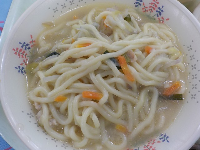 今日の給食 野菜たっぷり塩タンメン コーンブレッド じゃがいもの中華あえ 由良早生みかん 牛乳