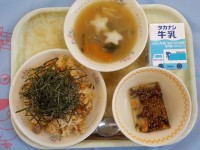 今日の給食 ごはん いかのねぎ塩焼き ゆかりあえ とん汁 牛乳