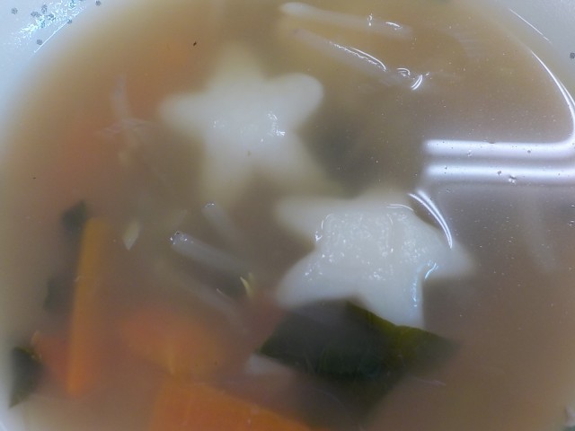 オーブンで焼いたあと、酢醬油で作ったタレをかけています。また今日のスープには星型のトッポギが入っています。もちもちっとしているので、のどにつまらせないよう よくかんで食べましょう。