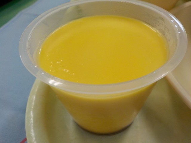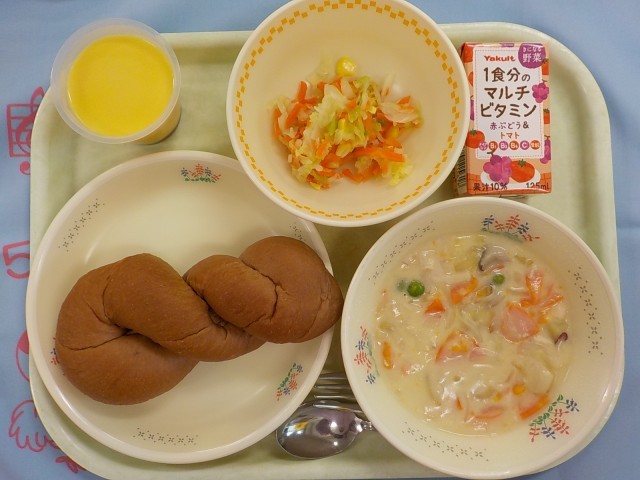 今日の『シチュー』には、2種類のさつまいもが入っています。オレンジ色の「ハロウィンスウィート」という品種と、「紅はるか」という品種の2種類です。見た目や味のちがいを感じながら、味わって食べてみてくださいね。また、デザートには『かぼちゃプリン』を出しました。かぼちゃのペーストを入れたので、ふつうのプリンよりも濃い色をしています。今日は牛乳のかわりに「赤ぶどう&トマト」のジュースを出しました。ビタミンがたっぷり入っているので、飲むとかぜをひきにくくしてくれます。