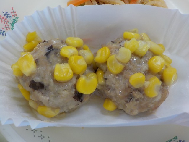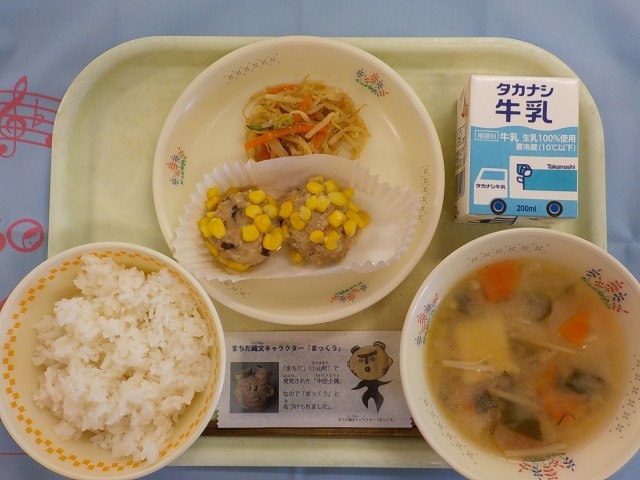 今日は、10月~11月の「文化財ウィーク」にちなんで、『まっくう味つけのり』を出しました。「まっくう」はまちだの縄文キャラクターで、町田市で3400年も前に見つかった土偶(土でできた人形)がモデルになっています。のりの袋にまっくうについて書かれているので、ぜひ読んでみてください。また、文化の日や菊の季節にちなんで、『菊花蒸し』を出しました。肉団子のまわりにコーンをたっぷりつけて、菊の花に見立てています。