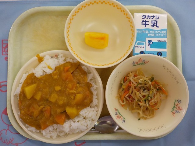 今日の給食 秋野菜カレーライス 糸寒天と野菜のあえもの 柿 牛乳