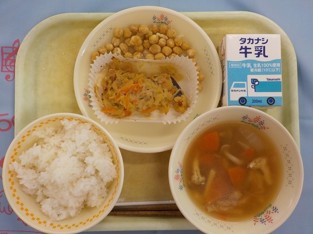今日の給食 ごはん 魚のチャンチャン焼き ひよこ豆のから揚げ 吉野汁 牛乳