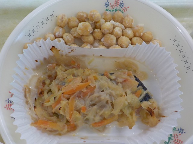 『チャンチャン焼き』の魚は、「ます」というお魚です。今日は上にたくさんのやさいをのせてオーブンで焼きました。魚の身をほぐして、やさいとタレとよくまぜながら食べるとおいしいです。『吉野汁』は、奈良県の吉野という場所の郷土料理で、「くず粉」が有名な地域です。吉野汁はその「くず粉」をとかしてとろみをつけるのが特徴です。給食ではなかなか手に入らないので片栗粉を使っていますが、とろみがついていると冷めにくくて美味しいです。