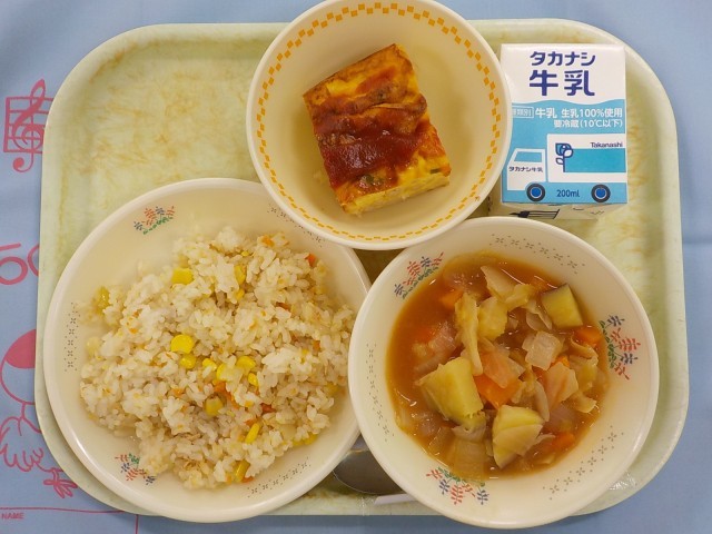 今日の給食 ガーリックツナコーンピラフ チーズスパニッシュオムレツ 野菜とトマトのおスープ煮 、牛乳