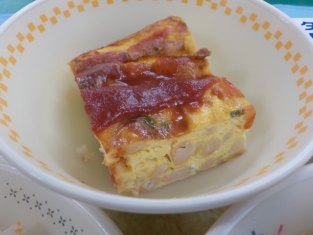 今日の『スパニッシュオムレツ』には、チーズが入っています。みなさんは、チーズがなにからできているか知っていますか?答えはみなさんが毎日飲んでいる「牛乳」です。牛乳の中の固まる部分だけを取り出して作られているんですよ。牛乳の栄養がギュッとつまった食べものなんですね。特にカルシウムの吸収力がすごいので、少しの量でも骨や歯を丈夫にしてくれます。今月の目標は、「感謝のきもちをもって食べましょう」です。野菜を作ってくれている人、食材をはこんでくれる人、調理をしてくれる人など、さまざまな人への感謝のきもちをもって、よくあじわって食べましょう。