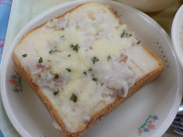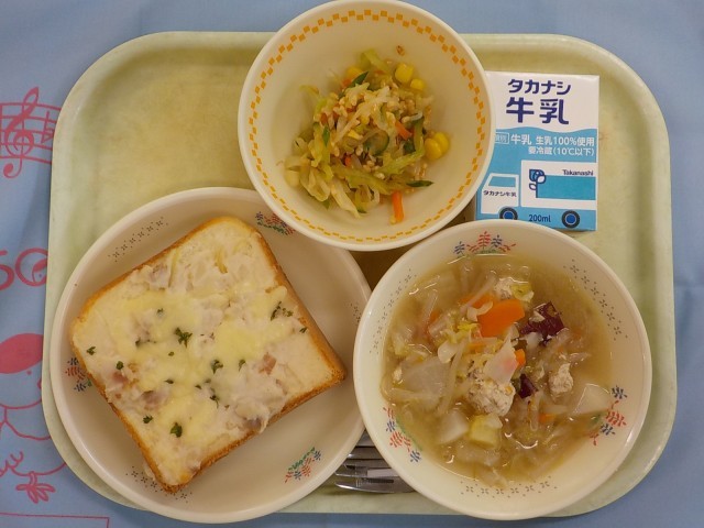 今日の給食 白いんげん豆のトースト プチっと玄米サラダ 肉団子と野菜の具沢山スープ 牛乳