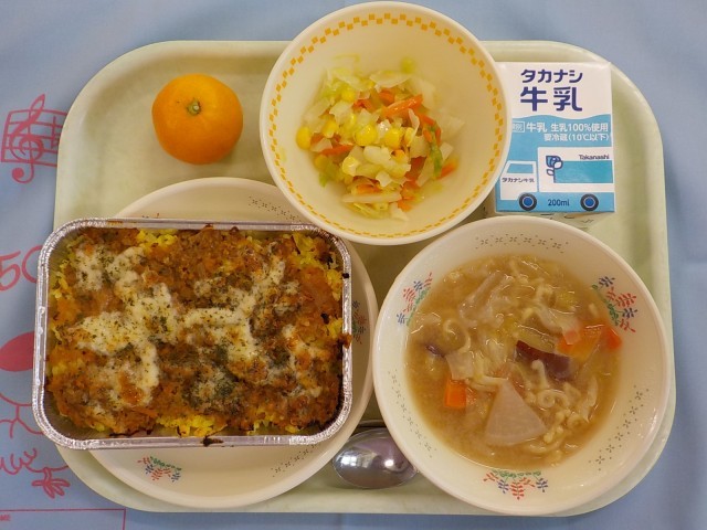 今日の給食 焼きチーズカレードリア コールスローサラダ ABCスープ みかん 牛乳