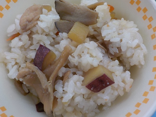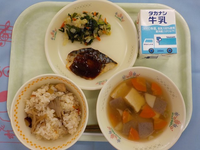 今日の給食 【和食の日献立】 秋の香りごはん 魚のゆずみそかけ わかめ入りおひたし のっぺい汁 牛乳