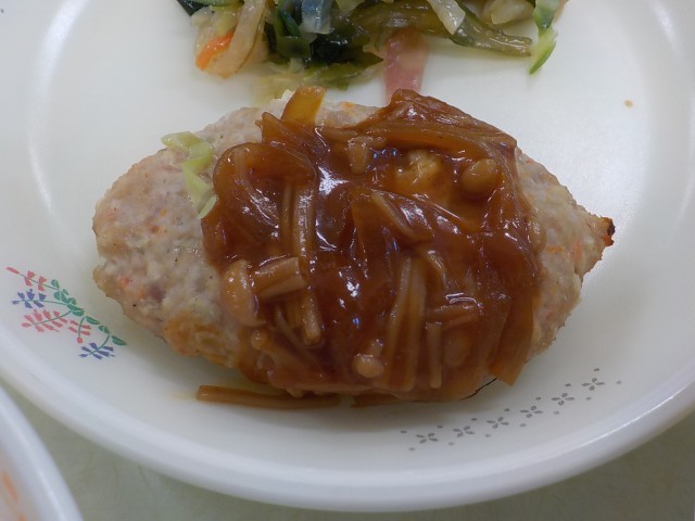 『ハンバーグ』には、ひき肉だけでなく、とうふや玉ねぎ、にんじん、しょうがも入っています。とうふを入れることによって、ふわふわな食感にすることができます。ハンバーグを作るときのコツは、「タネをよく練ること」と「丸めるときに空気を抜くこと」です。今日はハンバーグだけでなく、デミグラスソースも1から手作りをしています。たまねぎをじっくりと炒めて、ケチャップやソース、赤ワインなどを入れて丁寧に煮て作りました。