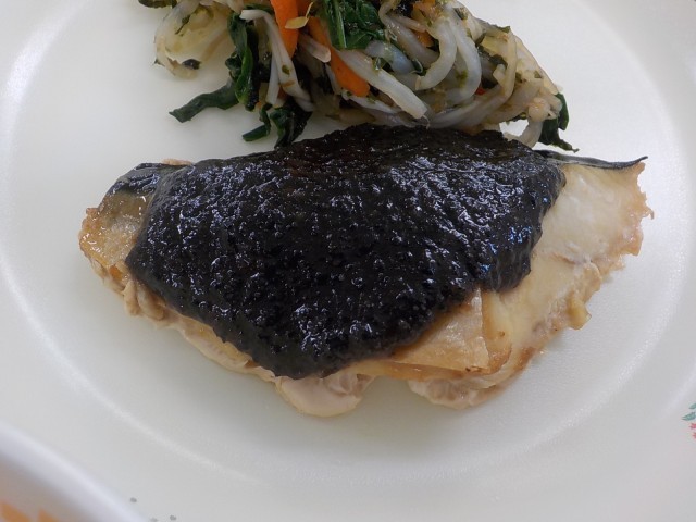 今日の給食 麦ごはん 魚の黒ごまみそだれ ほうれんそうのいそおかかあえ 呉汁 牛乳