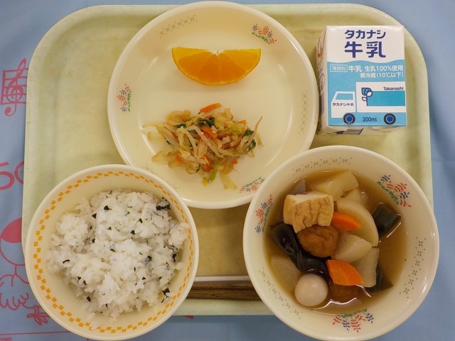 今日の給食 わかめごはん おでん からしあえ くだもの(べにマドンナ) 牛乳