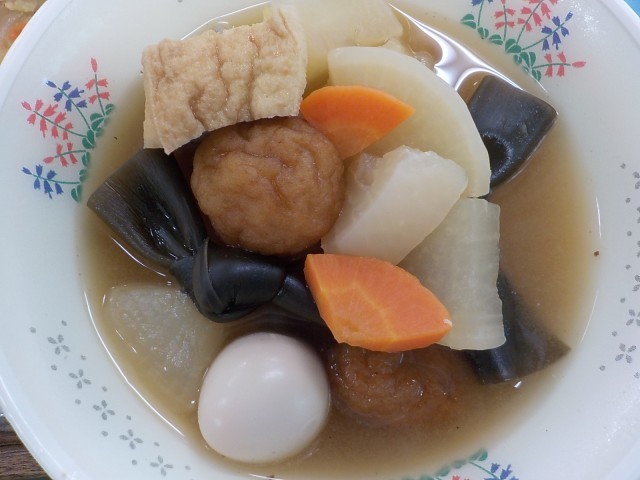今日の『おでん』には、9つのたべものが入っています。だいこん・にんじん・こんにゃく・結びこんぶ・がんもどき・さつま揚げ・生揚げ・ちくわ・うずら卵が入っています。ぜんぶを一緒に煮ることで、それぞれのおいしさが汁にとけだしてさらにおいしいおでんになります。また、おでんのおいしさのポイントのひとつ、「汁」には、かつお節と結びこんぶからとった「だし」を使っています。だしの「うま味」がさらにおいしくしてくれています。今日のくだものは、「紅マドンナ」という名前のくだものです。