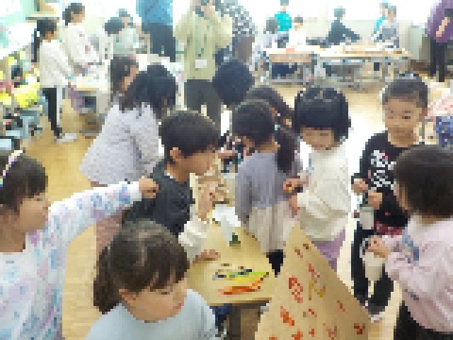 今日は園児たちを招いて、あきまつりを開催しました。事前準備も万端で、すっかりお姉さん、お兄さんになっています。でも一緒に遊びたい気持ちもあふれてます。